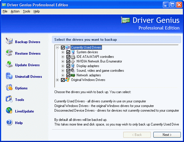 Driver Genius is a professional tool for backing up or restoring the drivers, it can fast detect all the devices in computer and backup the drivers, and it can make the drivers into the zip-compressed format or self-extractor format files.